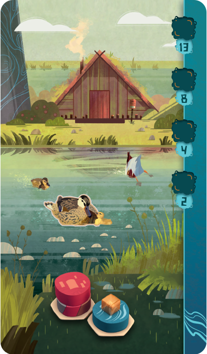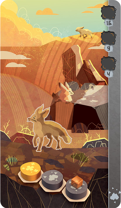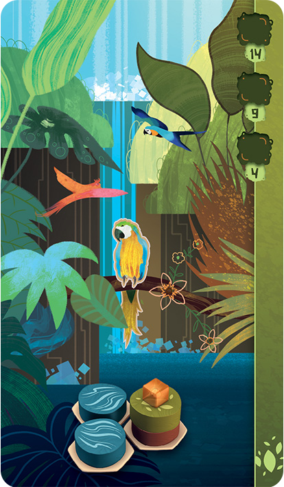 You can also take an Animal card during your turn. Animal cards have specific arrangements of tiles on them that, when created, will score you extra points at the end of the game. You score these points by placing a small animal cube on the corresponding tile when you’ve completed the arrangement on the animal card to represent that these animals have moved into that habitat.