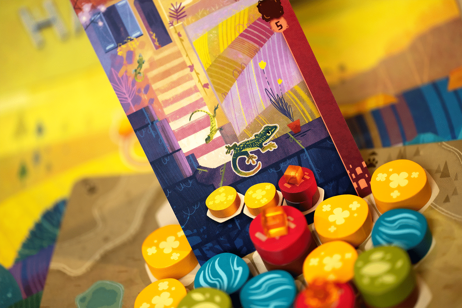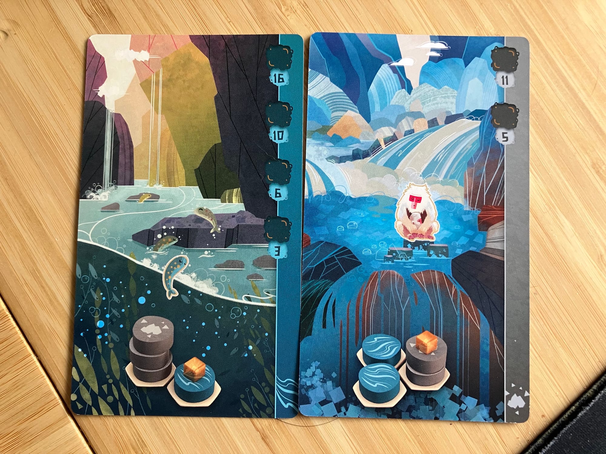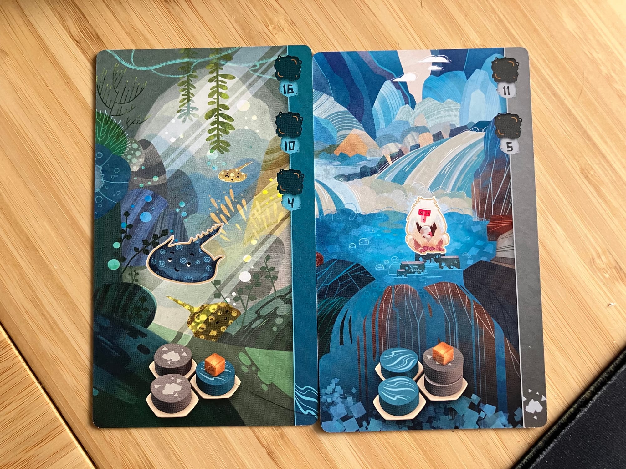 The beautiful moments come when you find two animals that love to be neighbors. These sting rays want to live in a river next to two small hills...but they only lock the river in. You can build their habitat and then continue to stack rocks to attract those monkeys later! It’s in finding these small harmonies (haha) between different animals where the game really sings, that “hell yes” moment of realizing a perfect turn of tiles and animal cards that scratch my brain’s puzzle solving centers just so. The wooden habitat tiles add that extra tactile “oomph” that a good board game needs, and the whimsical illustrations on the animal cards make each draw of the animal pile a new visual delight.
