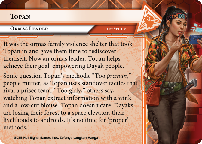 The new set showcases so many reasons I have loved this game, and even more importantly, why I love the broader netrunner community. Not only is the game mechanically spectacular, but NSG really goes the extra mile when considering inclusivity and representation. There are many queer members of NSG and their input shows in so many ways. Elevation is set in a futuristic version of Borneo, in Kalimantan, and includes many new Identities, the cards that you essentially play as and build your deck around, and in them you see a breadth of people. These identity cards include pronouns for the different runners, and on the back you get a story blurb for each.
