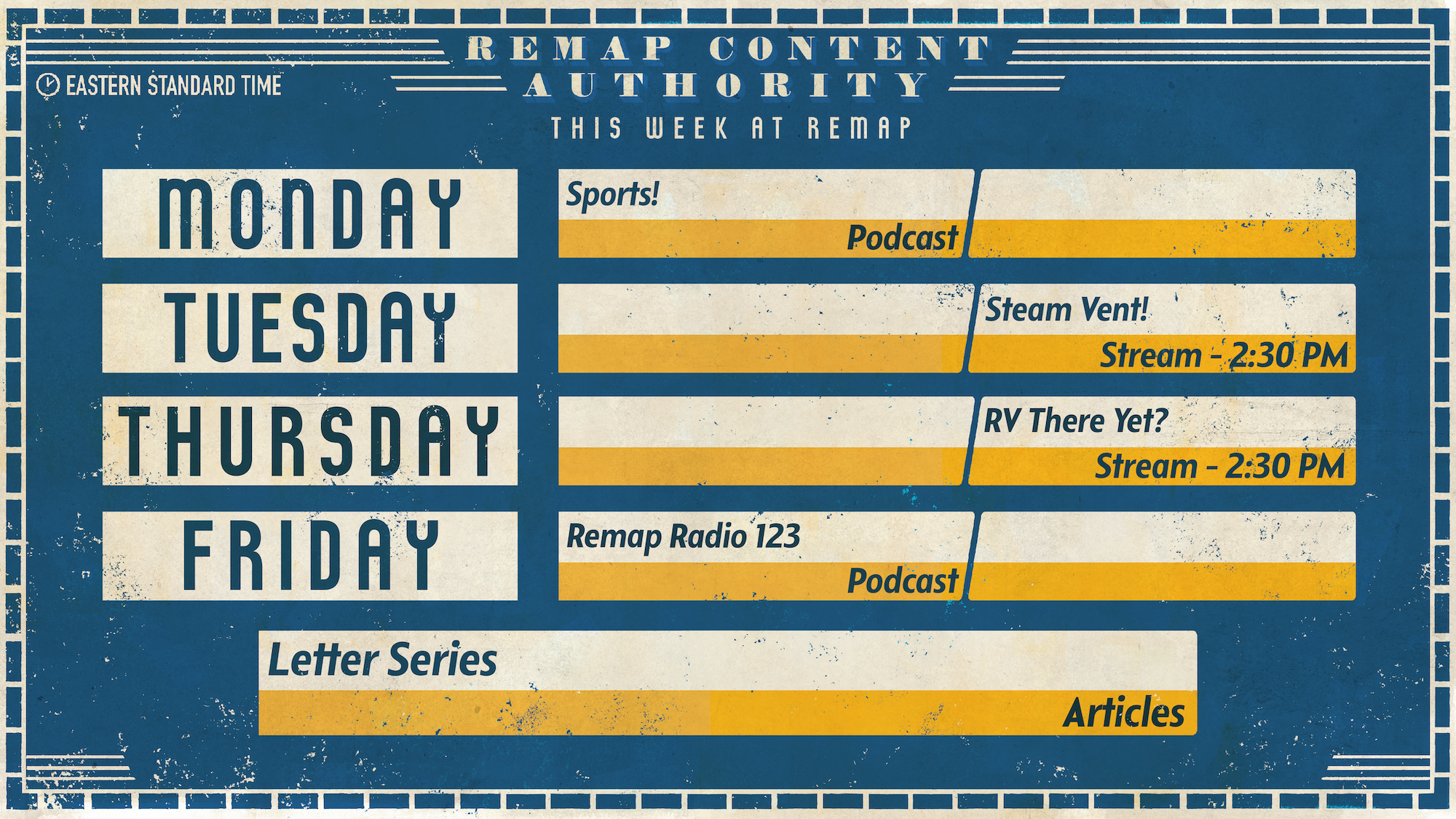 - STREAM: RV There Yet? – I guess we're not done with this? For some reasons that will be disclosed on a later HOA, this might shift days and/or become something else, depending on Rob's schedule. Second stream will still happen.