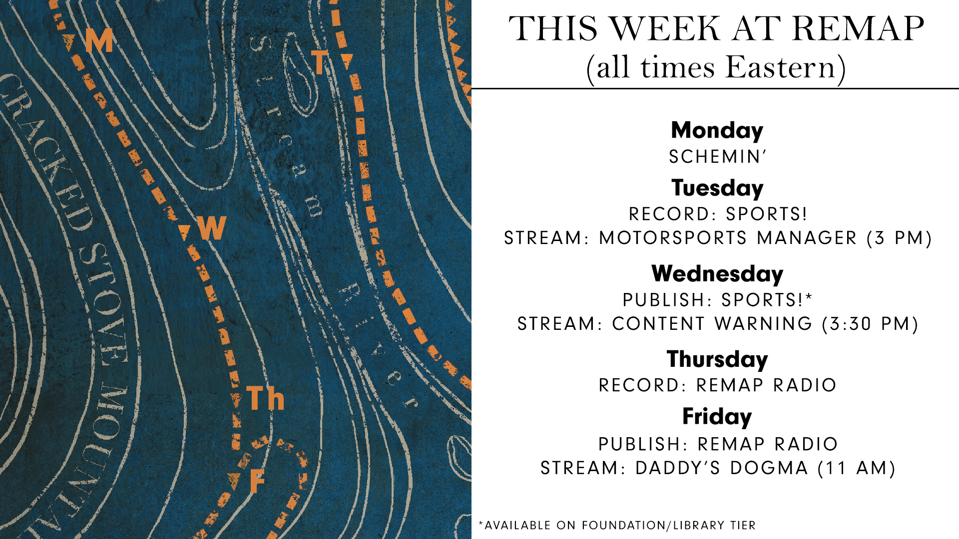 - MONDAY: We often list this day often as "scheming," but in reality, Monday is a huge admin day for Remap. It's where we squeeze in doctor appointments, backend work, editing clips for social media, etc. It's kind of a catch all day, before things shift into earnest on Tuesday. For me personally, it's usually where I do most of my work on Crossplay, so I can then focus on Remap.