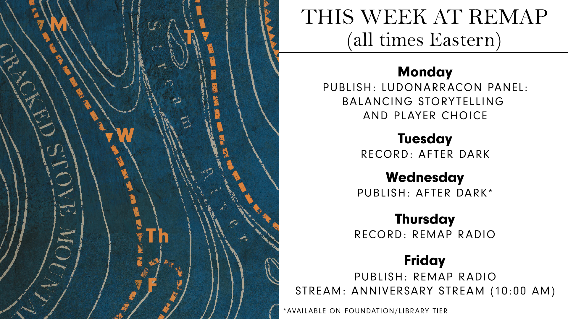 - TUESDAY: We'll record an After Dark ahead of Remap's first anniversary. In the past, we've recorded these before a big moment, as a way of capturing our thoughts in a little time capsule. Naturally, we're a ball of anxiety all over again.