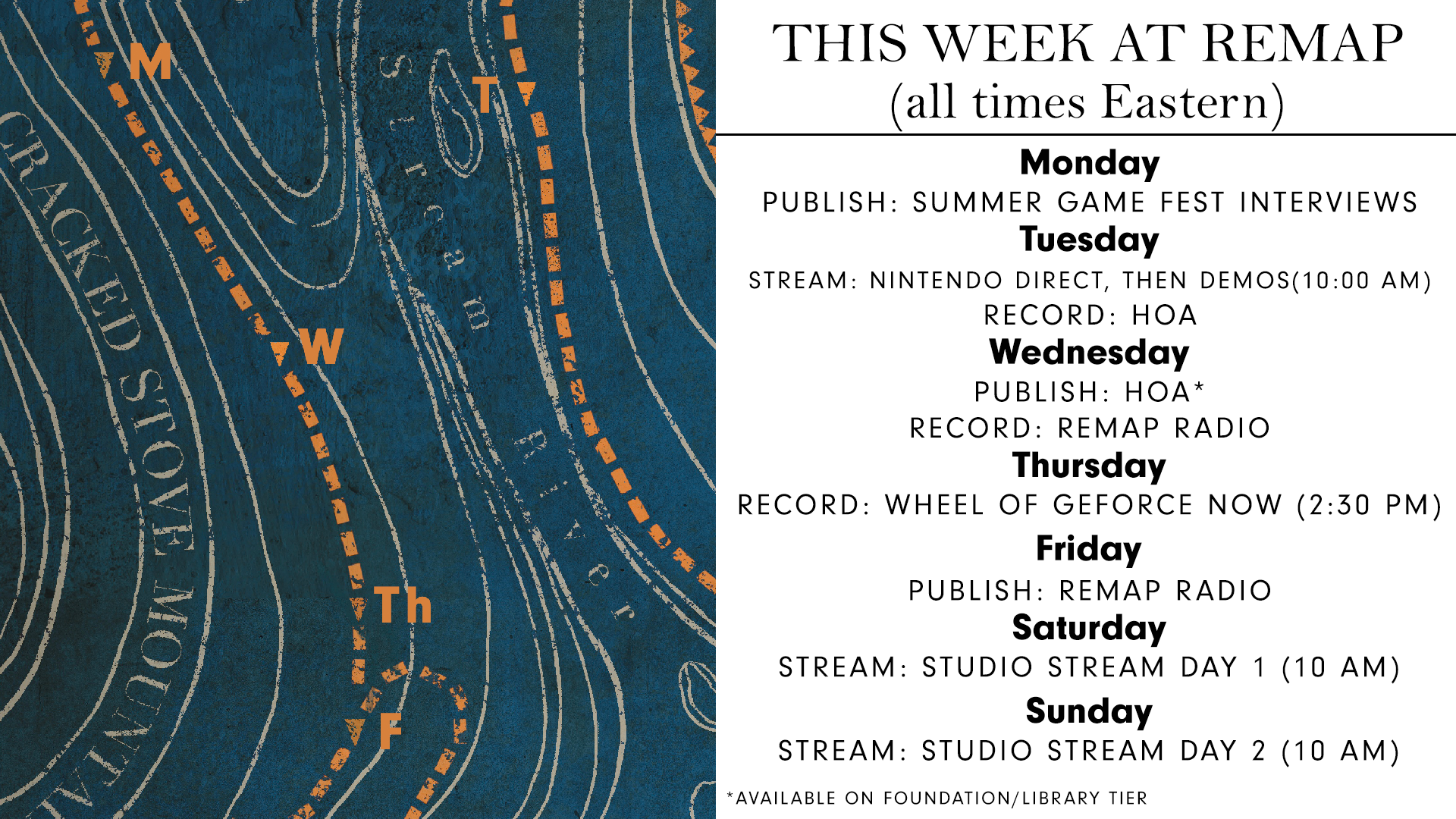 - WEDNESDAY: HOA will hit Foundation/Library tier feeds, and we'll record Remap Radio a little early, because of the travel/setup for later this week.