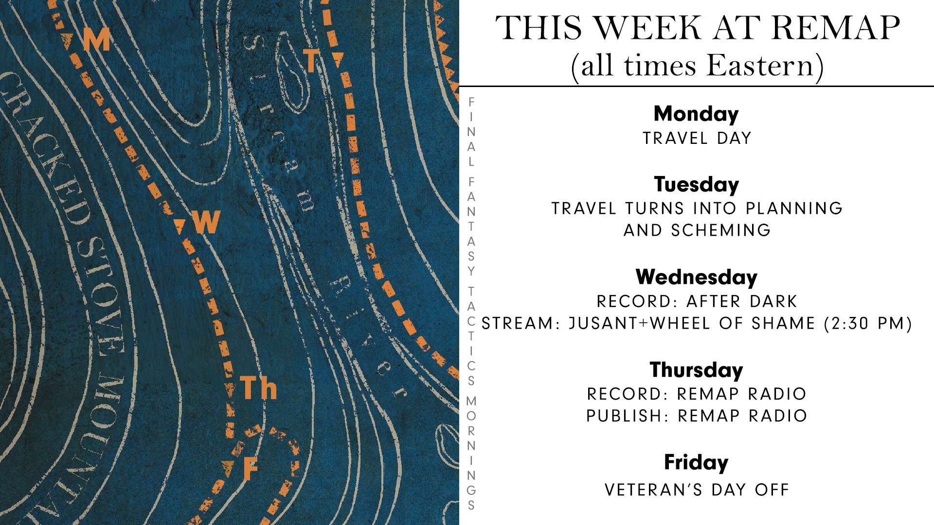 - THURSDAY: It's Remap Radio recording time, baby! It'll also publish later that day, because...