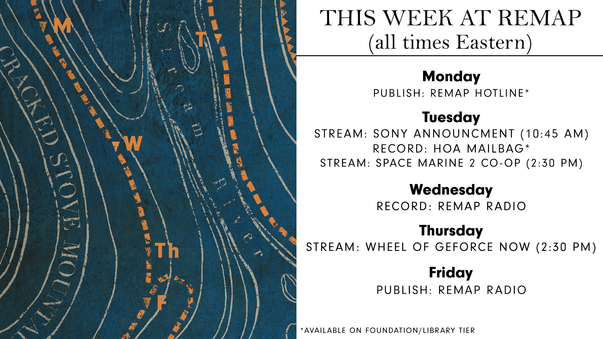 - WEDNESDAY: Because of our GeForce Now streams, we're moving Remap Radio recording to Wednesday. So, we'll get that in the bag. There's plenty of games we didn't end up having time for last week.