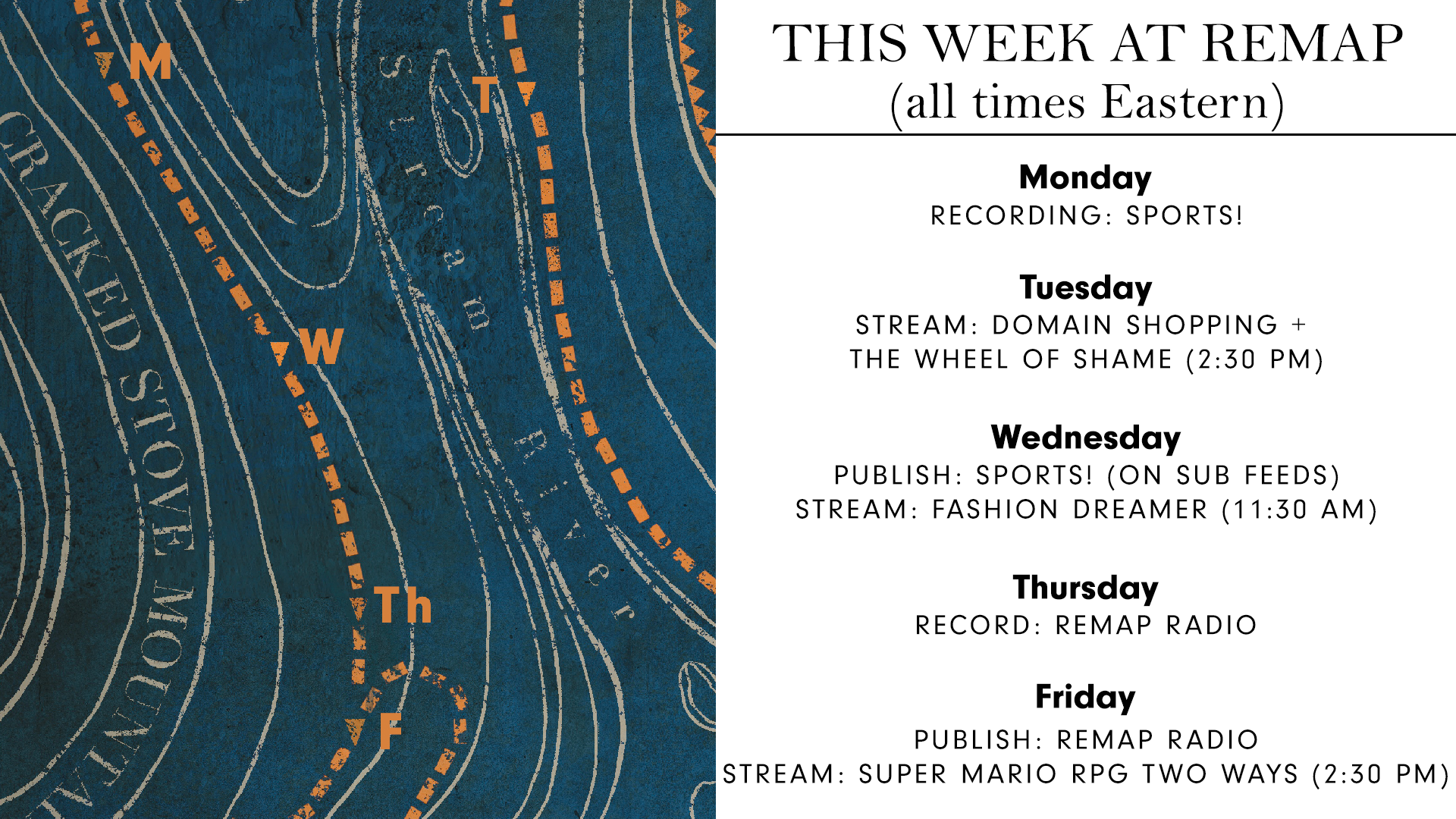 - FRIDAY: The last day before Remap's holiday break—we're taking Thanksgiving week off—Patrick and Cado will play Super Mario RPG, old and new, side-by-side. You'll also get to hear Remap Radio.
