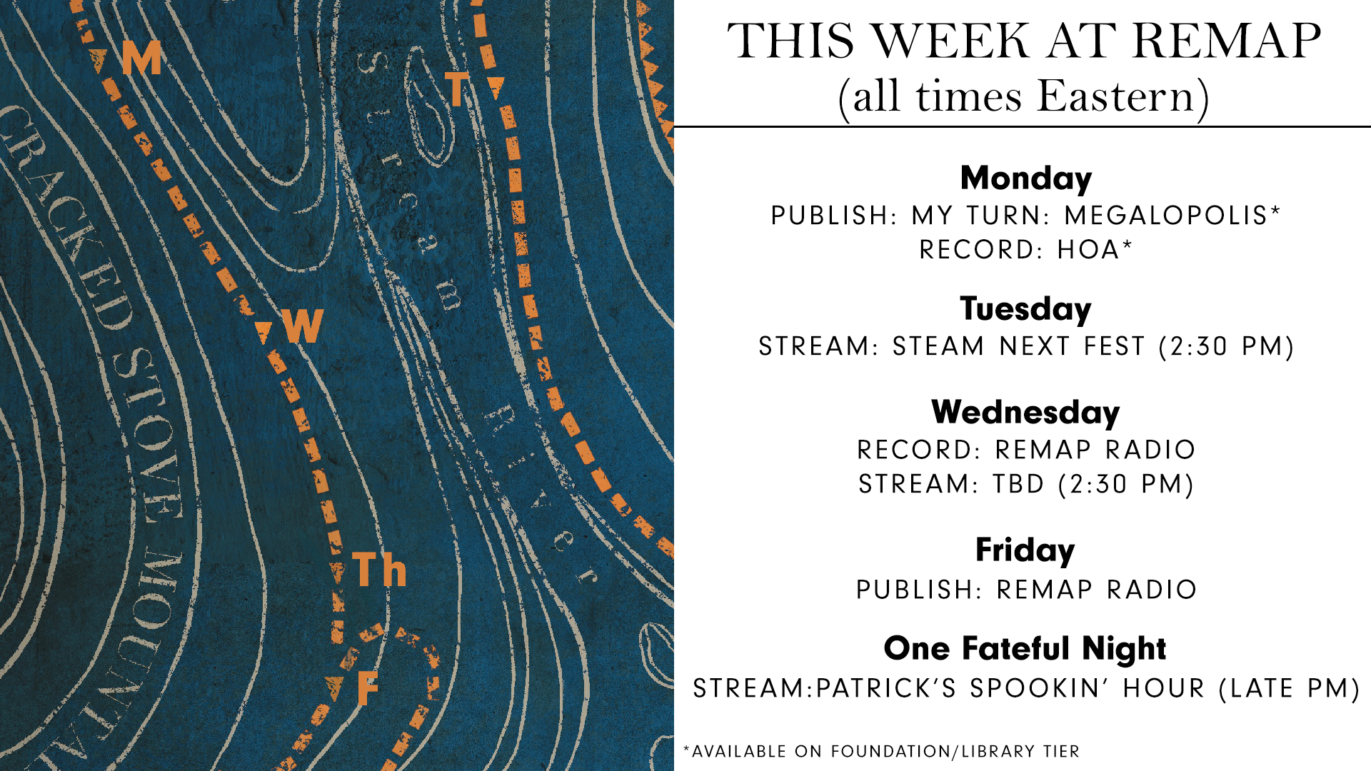 - FRIDAY: Remap Radio will come out. It's also possible Cado will have another lil' afternoon stream, which they've been doing when weekday work wraps up.