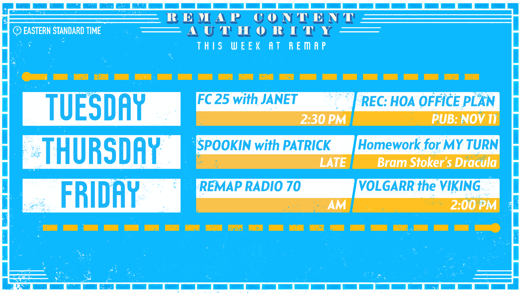 How nice it was to have an entire weekend where my frequently frustrating football team simply didn't play! What a joy! But we'll be back to a world of nightmares this weekend. In the meantime, when I asked someone to build the scheduling graphic for this week, I wasn't anticipating we'd get something as snazzy as what Rob and Connor Fawcett, would helped design the entire visual language of Remap, had cooked up below. Planning for a live show tends to help get some projects over the finish line, but I'll have more to say about that soon...!