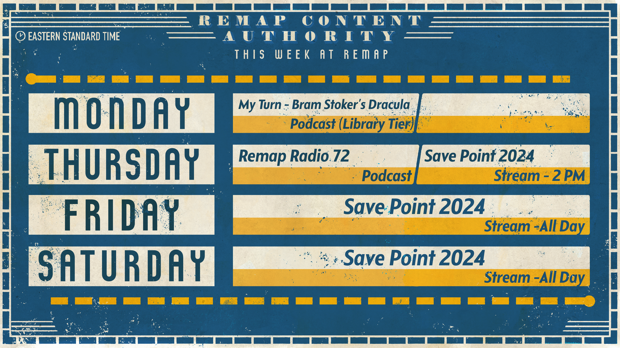 - STREAM – Save Point: The big one, with nearly three days of shenanigans. We've got some really fun ideas planned, but these things tend to take on a life of their own, so who knows what we'll be doing this week, truly.