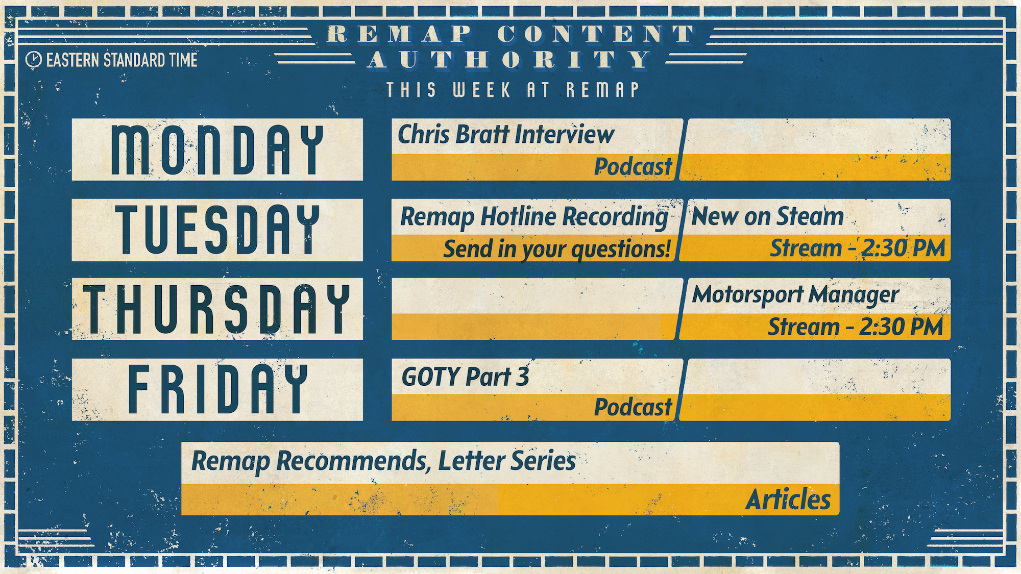 - PODCAST: Remap Radio – Yep, we're doing a third GOTY pod. My hope is that half of the podcast will also be a normal Remap Radio podcast. Stay tuned!