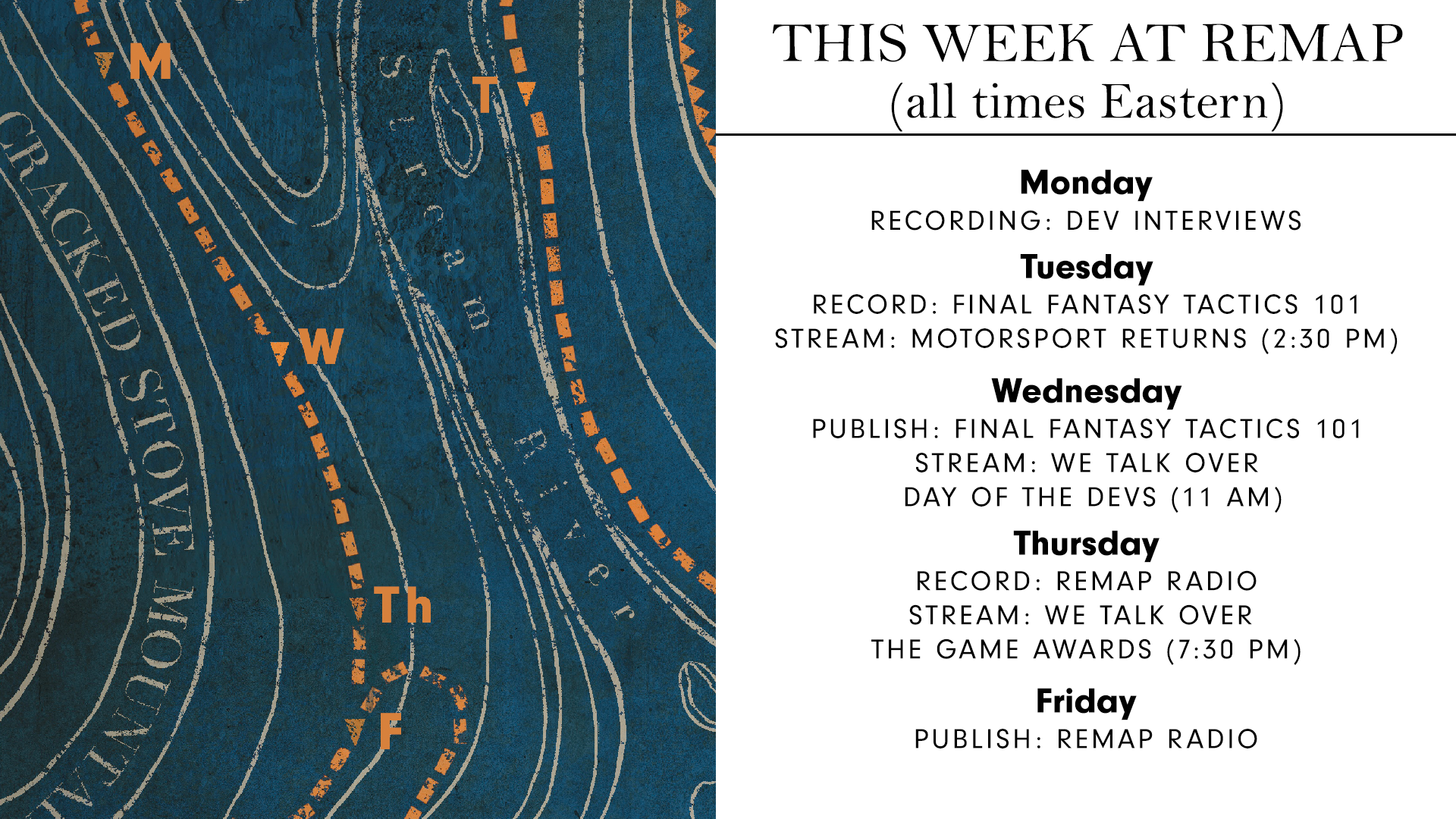 - THURSDAY: Remap Radio, with, hopefully, the return of an old friend. In the evening, we'll be spinning up the streams to watch The Game Awards, too.