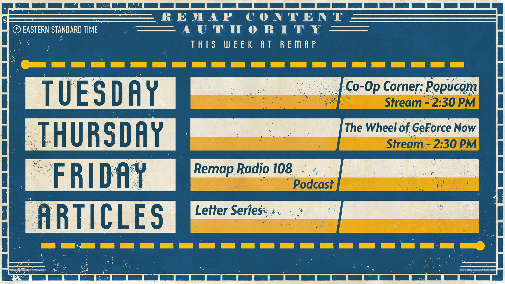 - PODCAST: Remap Radio – We are not anticipating Rob coming back for this, though that largely depends on what happens as Rob plugs all the wires back into his setup. Maybe we'll get lucky, but it's probably going to be another week.